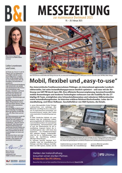 Die erste Ausgabe der B&I im Jahr 2026 erscheint bereits am 9. Februar. Sie enthält erneut die offizielle Messezeitung zur maintenance Dortmund. Damit begleitet Wolff Publishing auch 2026 Deutschlands Leitmesse für industrielle Instandhaltung und bietet Ausstellern eine frühzeitige Plattform zur Vorstellung ihrer Lösungen.
