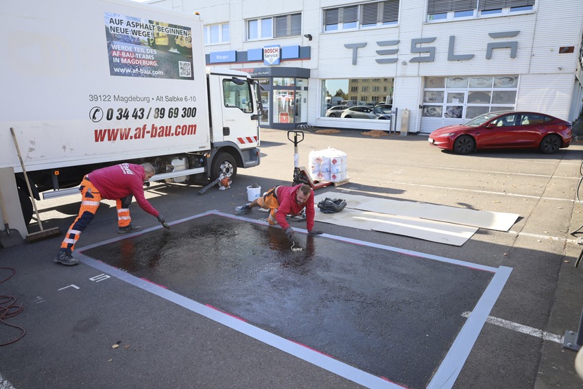 Nach einem Brandschaden auf dem Parkplatz eines Tesla-Showrooms in Leipzig musste eine beschädigte Asphaltfläche kurzfristig instandgesetzt werden. Statt eines vollständigen Neubaus der Fläche entschieden sich die Beteiligten für eine gezielte Reparatur der Deckschicht. Zum Einsatz kam ein PMMA-basierter Reparaturmörtel von Triflex, der eine schnelle und dauerhafte Instandsetzung ermöglicht.