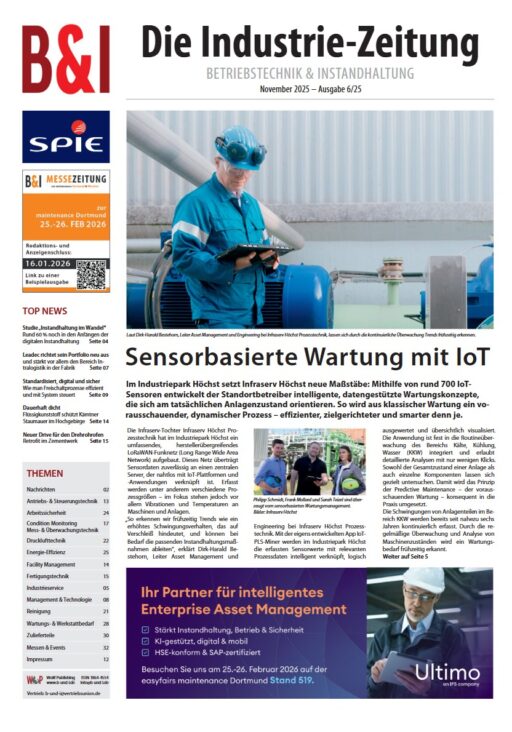 Infraserv Höchst treibt die Digitalisierung der Instandhaltung voran: Rund 700 IoT-Sensoren liefern Echtzeitdaten aus dem laufenden Betrieb und ermöglichen eine zustandsbasierte, vorausschauende Wartung. Die aktuelle Ausgabe der B&I zeigt, wie aus klassischer Instandhaltung ein dynamischer, datengetriebener Prozess wird – und was die Branche daraus lernen kann.