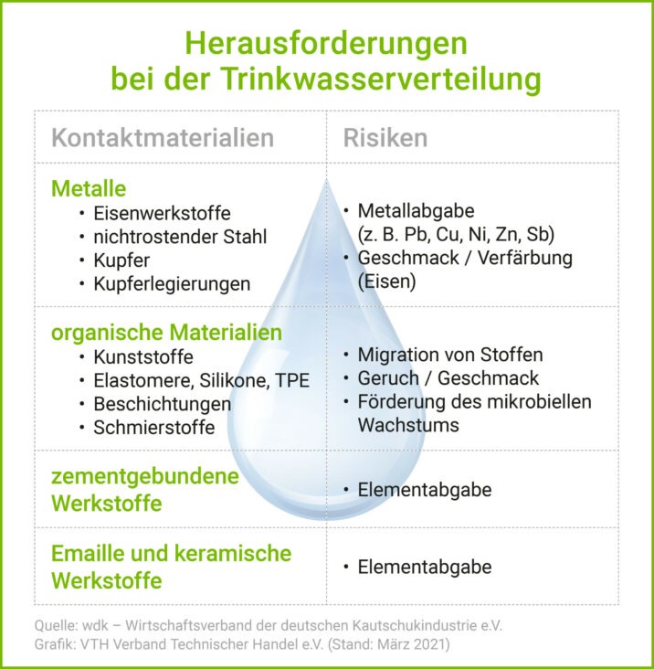 Die deutsche Trinkwasserverordnung (TrinkwV) regelt die Qualität von Wasser für den menschlichen Gebrauch. Ergänzend wird ab dem 21.03.2021 die „Bewertungsgrundlage für Kunststoffe und andere organische Materialien im Kontakt mit Trinkwasser“ (KTW-BWGL) verbindlich, die zur Instandhaltung oder Neuerrichtung von Anlagen für die Gewinnung, Aufbereitung oder Verteilung von Trinkwasser eingesetzt werden.