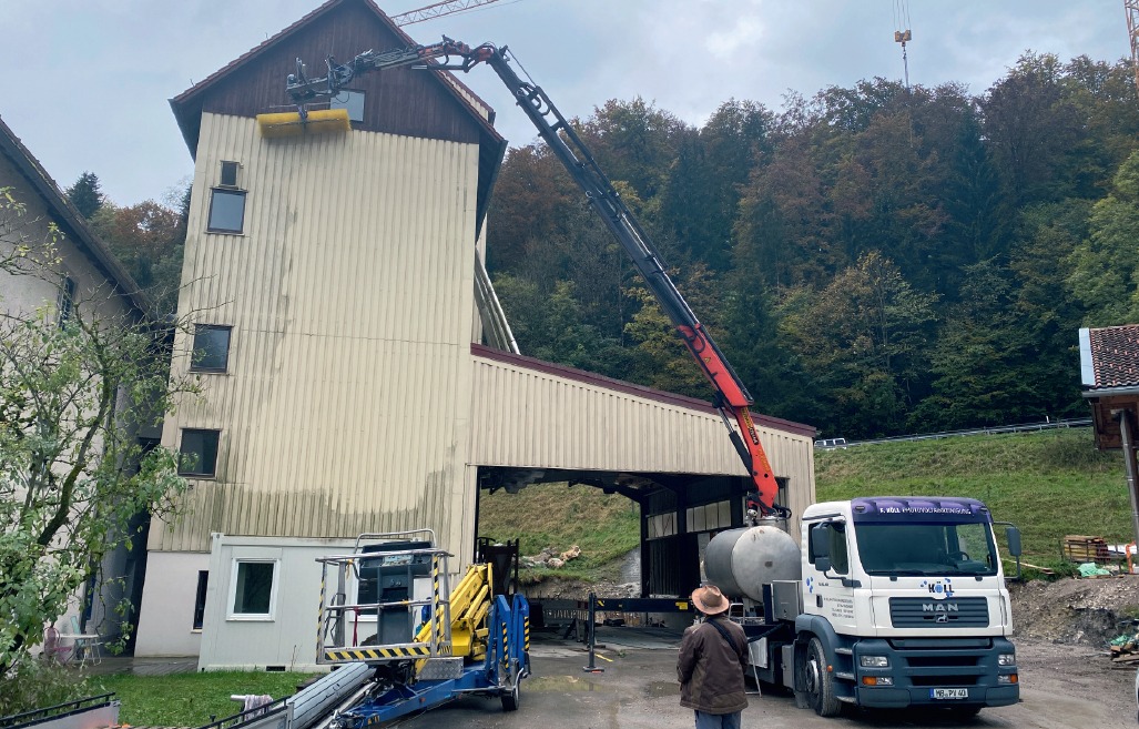 Der Geschäftsführer der Sunbrush mobil GmbH, Franz Ehleuter, und sein Team haben das Reinigungsgerät entwickelt, um damit Gebäudefassaden mit hohen Wänden reinigen zu können. Dieser Turm hat beispielsweise eine Höhe von 16 Metern. Bild: Sunbrush mobil