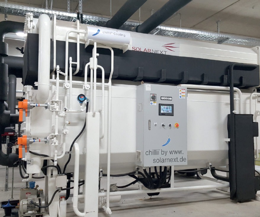 Im Bahnhofsgelände Nord Rosenheim arbeitet die Absorptionskälteanlage „chillii Cooling Kit“ der Solarnext AG. Sie stellt mithilfe von bis zu 95 Grad Celsius heißem Wasser Kaltwasser mit 8 Grad Celsius für die Klimatisierung des Quartiers bereit. Bild: Solarnext